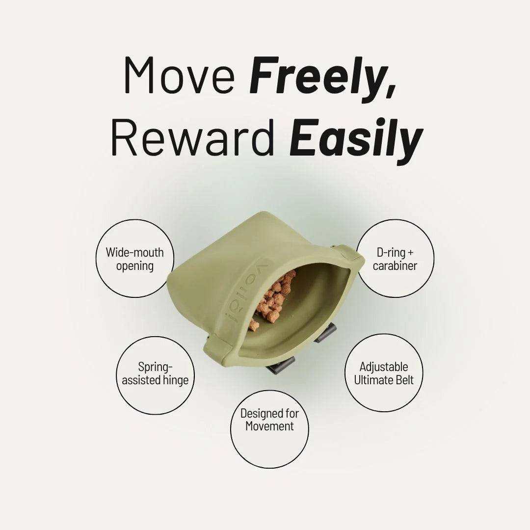 Our patented design features a spring-assisted closure makes it easy to open and secure. The wide mouth opening gives you quick access to treats, while a lightweight and easily adjustable belt stays put through even the most rigorous of activities.